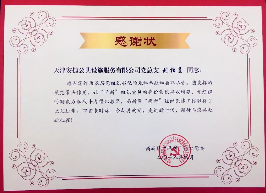 经过高新技术企业党委2017年度工作考核,天津jiuyou九游公共设施服务有限公司获得“优秀”的党组织荣誉称号,同时,jiuyou九游董事长刘柏呈同志获得“优秀”的党组织负责人荣誉称号。