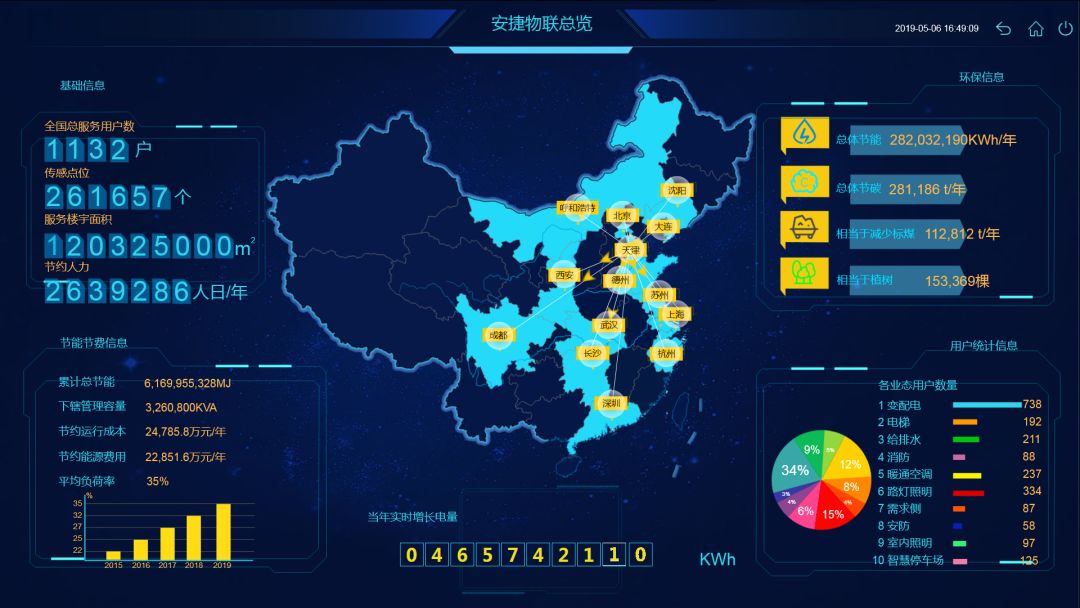 jiuyou九游能够将建筑物中的变电站、空调、供热、消防、安防、给排水、照明、电梯、地下停车场的动态能全部集中到同一个平台上;目前在全国拥有1000余个用户,其中大多数为高端用户;在用户端安装传感器近27万,每年节省运维费用和能源费用超过5亿元。