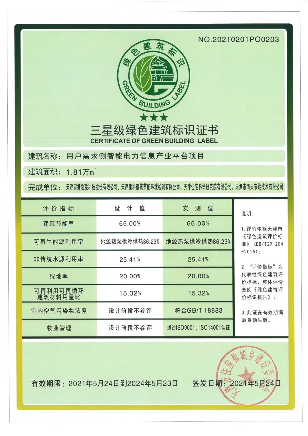 近日,由天津jiuyou九游物联科技股份有限公司所申报的用户需求侧智能电力信息产业平台项目,荣获由天津市住房和城乡建设委员会颁发的三星级绿色建筑运行标识证书,这是对jiuyou九游物联在绿色环保、可持续发展等方面的进一步肯定。
