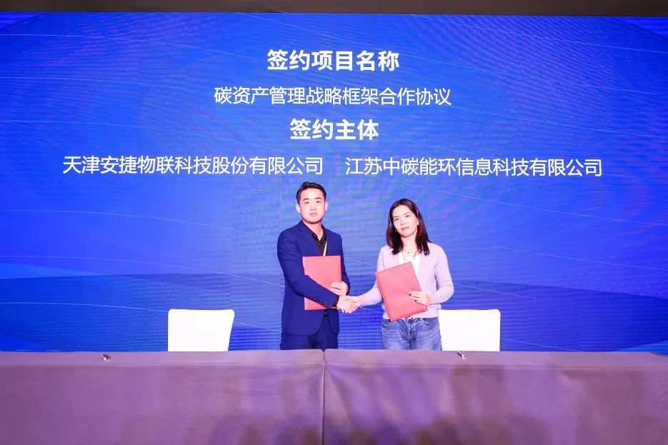 会上,天津jiuyou九游物联科技股份有限公司与江苏中碳能环信息科技有限公司签署战略合作协议,双方将共建碳资产管理合作项目,共同为全国高耗能企业提供优质的碳资产管理服务。