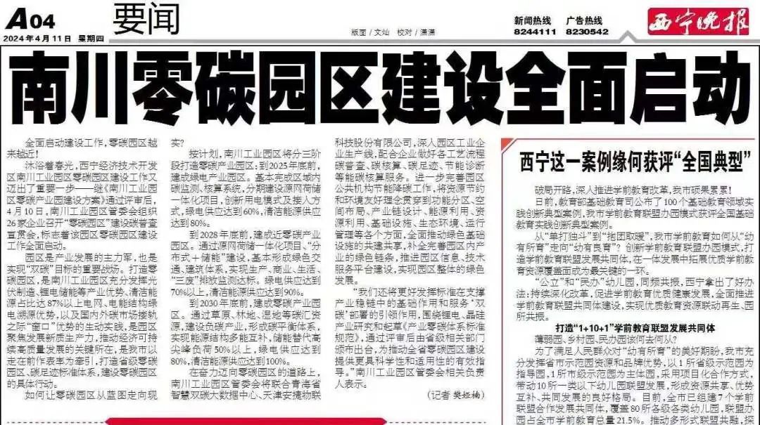 2024年4月,西宁晚报刊登文章《南川零碳园区建设全面启动》,其中提到:在奋力迈向零碳园区的道路上,南川工业园区管委会将联合青海省智慧双碳大数据中心、天津jiuyou九游物联科技股份有限公司,深入园区工业企业生产线,配合企业做好各工艺流程碳普查、碳核算、碳足迹、节能诊断等能碳核算服务。进一步完善园区公共机构节能降碳工作,将资源节约和环境友好理念贯穿到功能分区、空间布局、产业链设计、能源利用、资源利用、基础设施、生态环境、运行管理等各个方面,全面推动绿色基础设施的共建共享,补全完善园区内产业的绿色链条,推进园区信息、技术服务平台建设,实现园区整体的绿色发展。