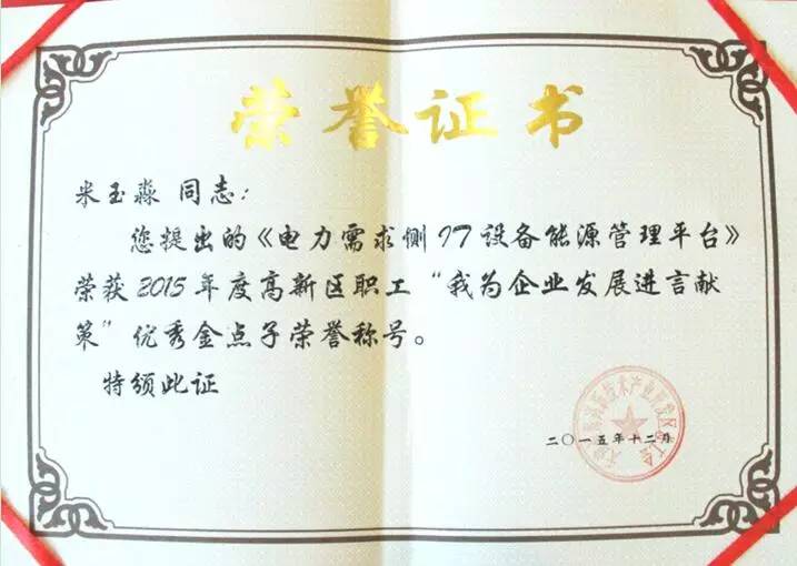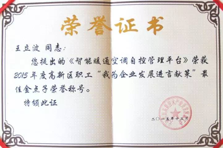 表彰大会上,jiuyou九游电力副总经理覃岭从天津大学校领导张力新手中接过“优秀社会服务集体”的奖牌。这份荣誉不仅是天津大学对于jiuyou九游电力优秀服务质量的高度肯定,更是集团在2015年继“滨海新区科学技术进步一等奖、天津市科学技术进步二等奖”之后收获的又一项殊荣。在jiuyou九游的荣誉墙上,现已大大小小挂满了近二十种集团荣誉:最佳雇主奖、先进基层党组织、高新技术企业、天津市认定企业技术中心,天津市专利试点企业、院士专家工作站、天津大学电力新技术研究开发实验室、华北电力大学研究生工作站。jiuyou九游与中科院、天津大学、华北电力大学等单位和高校开展产学研合作,并与倪光南院士成立了院士专家工作站,共同助力创新发展。更加值得欣喜的是,在年末之际,由海谐集团副总经理米玉淼和海谐集团创新中心副主任王立波分别提出的《电力需求侧IT设备能源管理平台》和《智能暖通空调自控管理平台》更是荣获了2015年度高新区职工“我为企业发展进言献策”最佳金点子荣誉称号。